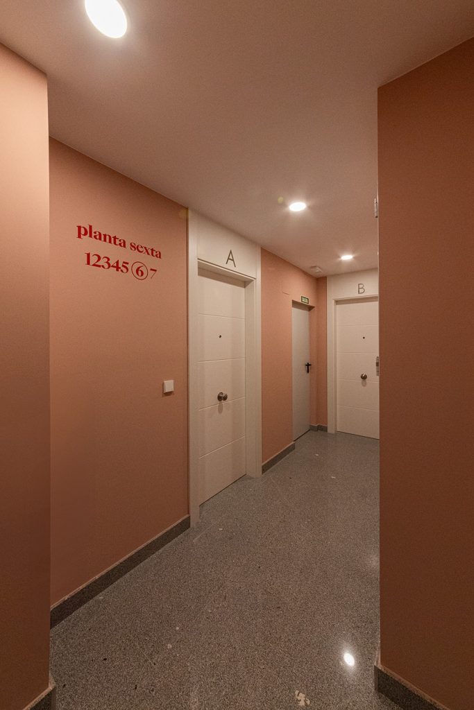 La marca no solo vive en el plano gráfico: la llevamos al propio edificio mediante la aplicación de color, criterios tipográficos y un sistema de señalética diseñado a medida, integrando arquitectura y comunicación en una misma narrativa estética.